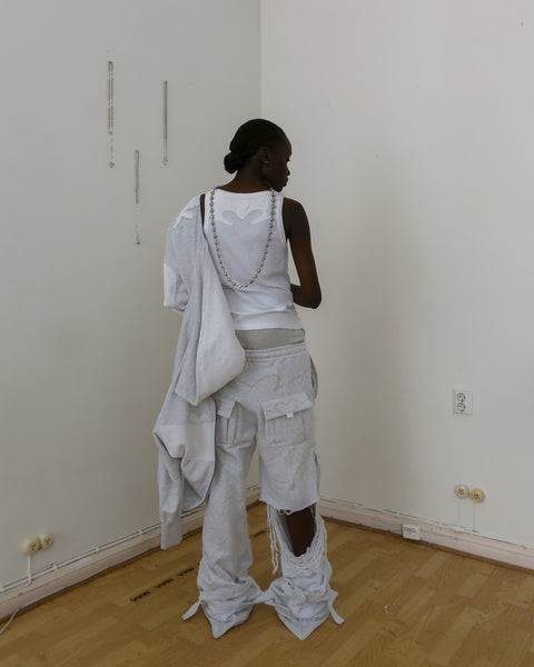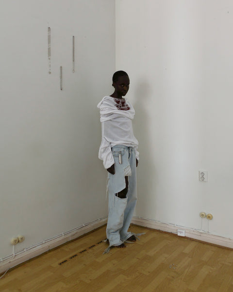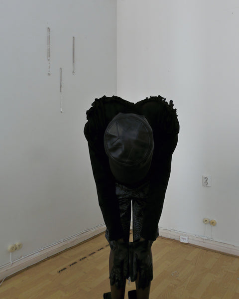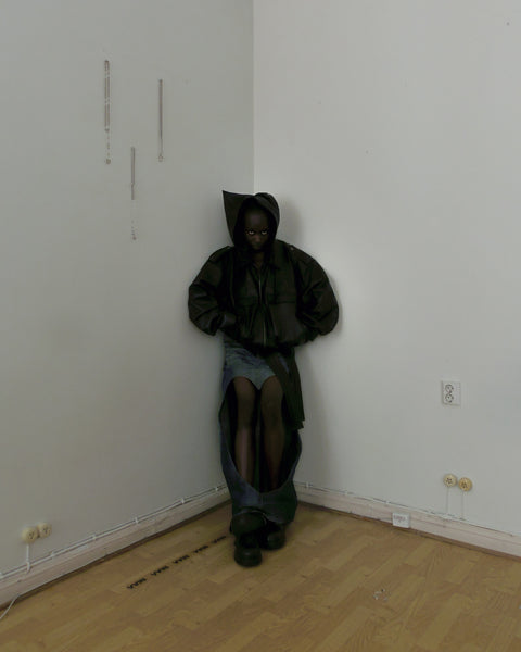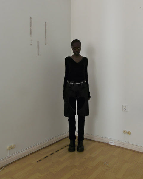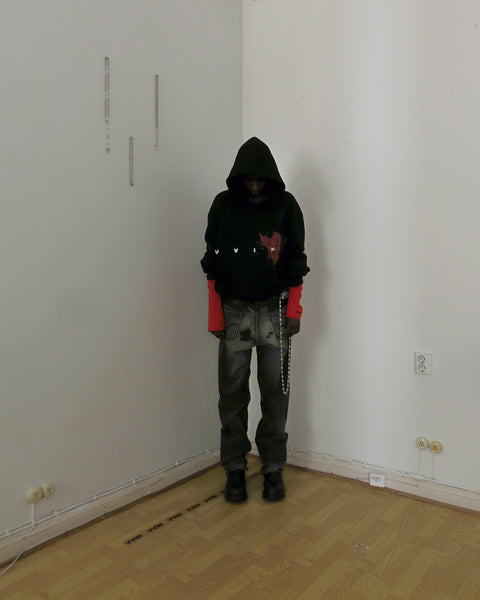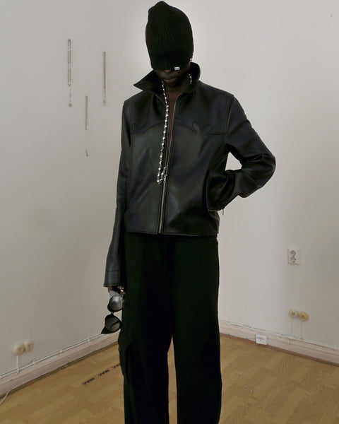 Denim, leather, and upcycled materials create a foundation that feels lived-in, worn, and real. Heart motifs appear as scars, stitches, and imprints present but never obvious. Muted tones and industrial influences mirror the city's atmosphere, while every piece carries a sense of purpose.